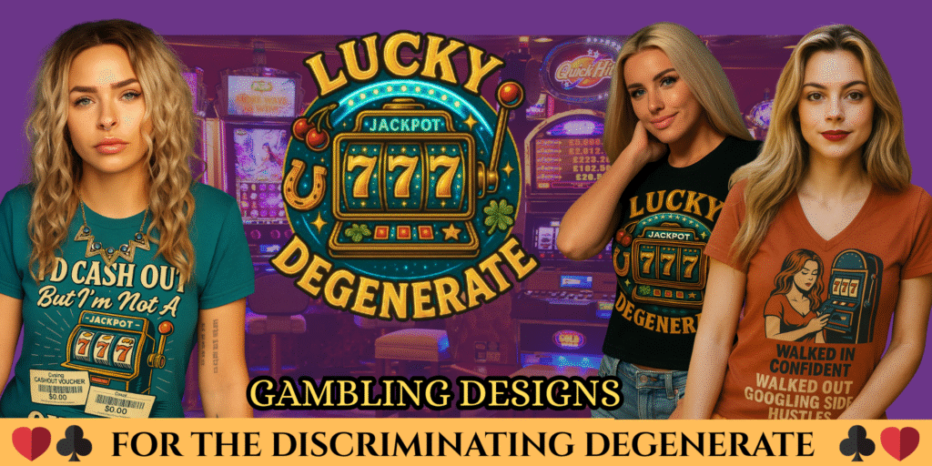 Hit the Shop. Place Your Bet. Look Like a Winner. SHOP NOW Why Lucky Degenerate? Lucky Degenerate is for the beautifully reckless — the ones who double down on bad decisions and great outfits. You’ve probably said “just one more spin” 14 times today.But hey, at least you looked hot doing it. Featured Design: Lucky Degenerate Brand Logo Technically it’s just a t-shirt.But if you’ve ever told yourself, “I’ll stop after this one,” and didn’t — it’s basically your uniform. Shirts That Talk Back Every design has something to say — and it usually involves money, mayhem, or bad decisions. High Stakes, Higher Style Because nothing says “all in” like looking like a million bucks—even if you’re down to your last chip. Looks That Win the Jackpot Luck comes and goes—style like this hits every time. Dressed to win, even if you just lost rent. Don’t Just Play — Dress the Part. Our designs talk back, cash in, and look damn good doing it.Find your favorite lucky look now. Snag the Winning Look